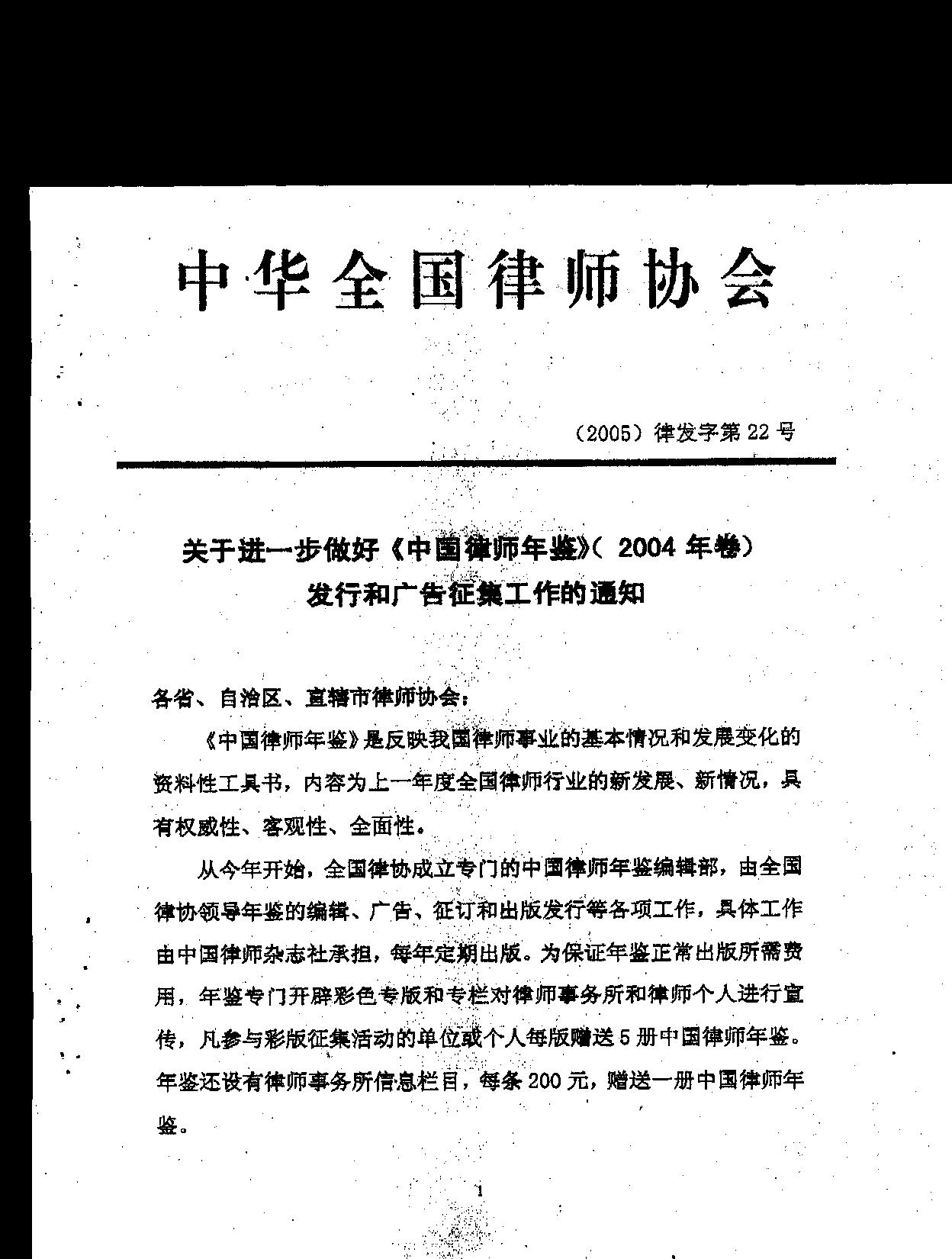 现将全国律协《关于进一步做好〈中国律师年鉴〉(2004年卷)发行和广告征集工作的通知》转发给你们,请你们根据实际需要,以自愿为基础,组织广大律师和律师事务所积极参与。