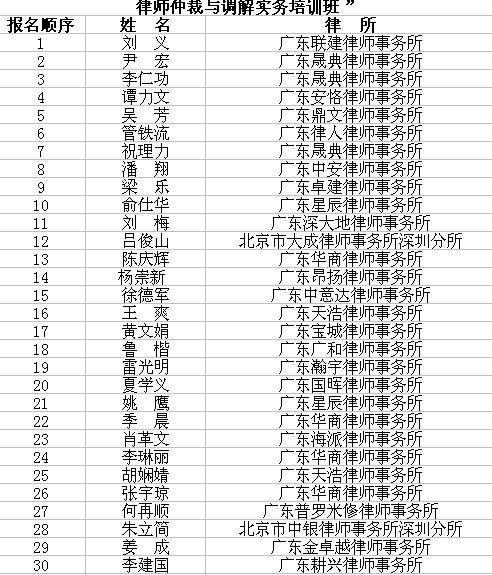 已经报名而未能被安排参加第一期培训班的律师,此次报名仍然有效。我会将依据其报名时间的先后顺序优先安排其参加今后的系列培训班。名单如下:
