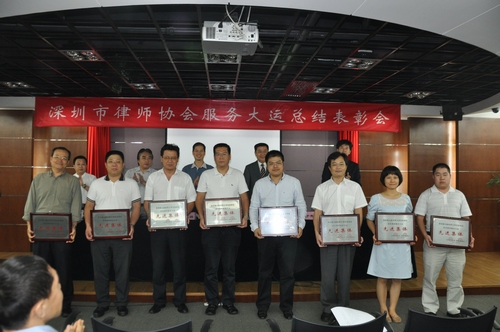 市律协余俊福会长在讲话中指出,我市律师作为中国特色社会主义法律工作者,不断强化服务大局意识,深入基层提供公益法律服务,涌现出一批为深圳经济社会发展做出突出贡献的律师及律师事务所,提升了律师行业的地位和影响力。在未来的工作中,希望全市律师继续发扬在服务大运期间表现出来的良好精神风貌,重点推进如下几方面的工作:一是要认真贯彻落实中办30号文件精神,坚持律师业“十二五”规划发展目标,主动服务党和政府中心工作,着力加强队伍建设;二是发挥专业优势,主动履行社会职责,积极参与前海开发等政府重大项目建设,充分发挥律师队伍在社会管理创新、社会矛盾化解等方面的重要作用;三是认真总结为大型活动提供法律服务的经验,进一步推进社会公益服务,体现我市律师队伍在深圳政治、经济、文化建设中的重要力量,实现我市律师有尊严地执业!