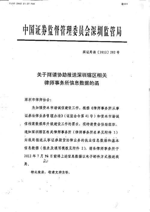 现转发中国证券监督管理委员会深圳监管局致我会来函,请各有关律师事务所于2012年7月20日(周五)前,按照来函要求向证监会深圳监管局报送律师事务所从事证券期货法律业务的执业信息数据和基本信息数据。报送方式见附件。