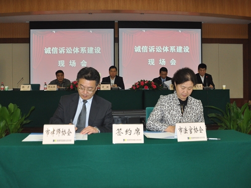 张勇会长和段秀荣副会长分别代表市律协、市法官协会共同签署全国首个《共建诚信诉讼体系公约》(以下简称《公约》)。《公约》倡导诉讼参与各方在参与诉讼过程中严格遵守法律规定的程序规则,杜绝恶意诉讼、虚假诉讼等违背诚信诉讼原则的行为,共同维护诉讼秩序,建设诚信为本的法律信用体系,营造公平正义的法治环境。