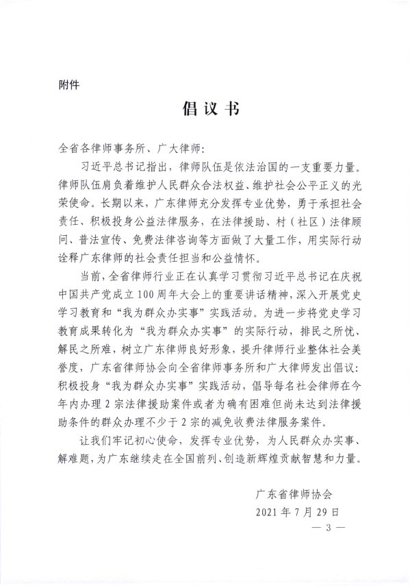 为开展好“我为群众办实事”实践活动,结合党史学习教育工作要求,省律师协会决定开展律师办理2宗法律援助案件或为困难群众办理2宗以上减免收费法律服务案件的倡议活动(以下简称“本活动”),现就有关事项通知如下:
