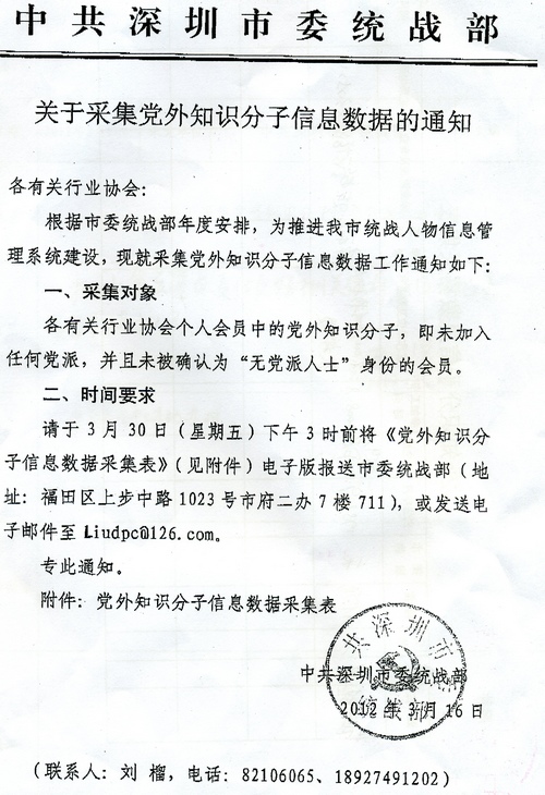 接市委统战部通知,为推进我市统战人物信息管理系统建设,现向我市有关行业协会会员采集党外知识分子信息数据,请符合采集对象的律师会员,以所为单位填写好《党外知识分子信息数据采集表》并加盖律师所公章(详见附件)于