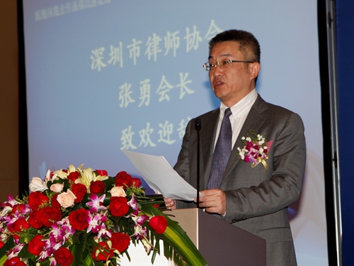 市律协张勇会长代表主办方致欢迎辞,感谢对司法部、省司法厅、省律协、市司法局的指导和支持及各界人士对深圳律师业的关注,指出,前海开发战略给深圳律师业带来了难得的发展机遇,希望论坛凝聚更多法律人士的智慧,承担起历史赋予的使命,积极服务于前海开发战略实施,助其打造成具有国际竞争力的现代服务业区域中心、现代化国际化城市经济中心和社会主义法治示范区,促进中国法律服务业创新发展。