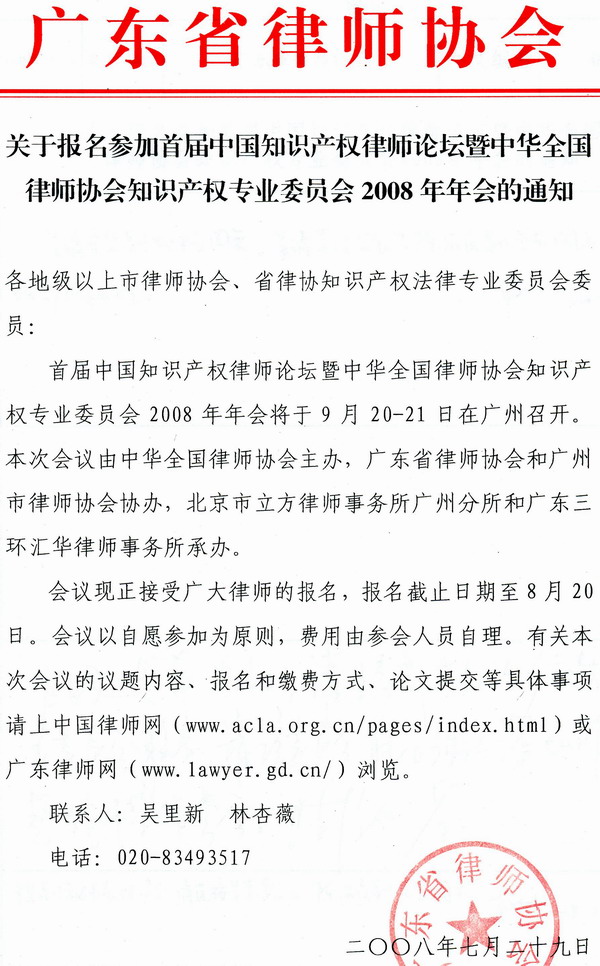附件:“关于报名参加首届中国知识产权律师论坛暨中华全国律师协会知识产权专业委员会2008年年会的通知”