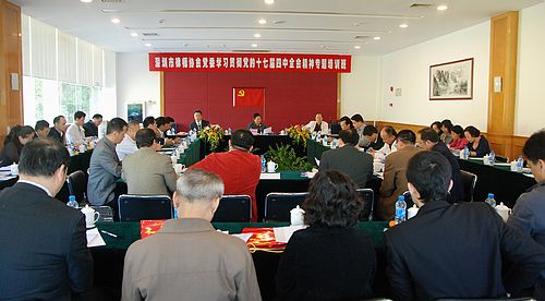 2009 年12月24-25日,市律协党委举办了学习贯彻党的十七届四中全会精神培训班。市律协党委张勇书记,周新锋副书记,党委委员、市律协副会长陈治民,党委委员邱伟平,纪检委员、广东省律师协会总监事郑剑民以及下属70个党支部书记、入党积极分子共60余人参加了此次培训。市委宣传部罗烈杰副部长,三届律协会长、律协党委原书记黄明根,王和平监事长,市司法局律管处杨少彬副处长,深圳市“两新”工委办公室副主任杨伟等应邀出席。