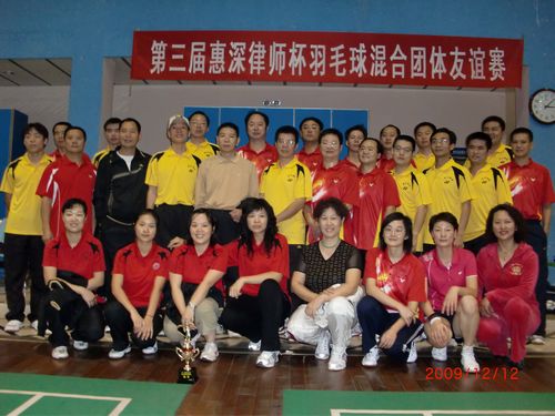 深圳律师羽毛球队是深圳律师传统的运动强队,每年的运动会上羽毛球比赛都是规模最大、参加人数最多、含金量较高的赛事之一,而且在参加历届“省港澳运动会”、“香港律师百年运动会”、“京津沪粤羽毛球对抗赛”等赛事中为深圳律师赢得了较多荣誉。深惠杯的比赛已经举办了三届,前两届也是深圳律师羽毛球队赢得该项赛事。