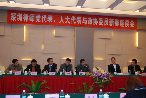 1 月7日 下午,市司法组织局召开了律师界党代表、人大代表及政协委员新春座谈会,共商深圳律师业发展大计。司法局副局长邹从兵,律管处处长李玉祥,副处长杨少彬、陈加满,市律协会长余俊福,监事长张善华,副会长于秀峰,党委书记张勇及20名律师界党代表、人大代表及政协委员参加了座谈会。