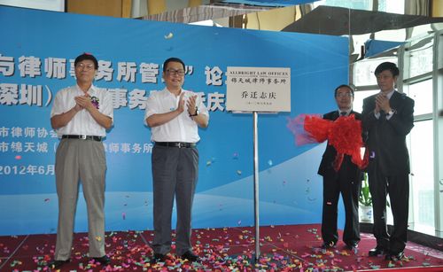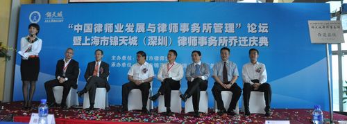 6 月9日 下午,由深圳市律师协会主办,上海市锦天城(深圳)律师事务所承办的“中国律师业发展与律师事务所管理”论坛暨上海市锦天城(深圳)律师事务所乔迁庆典在皇廷V酒店拉开帷幕。市委常委、副市长陈应春,前司法部律师公证司司长、现中国法律服务(香港)有限公司总经理杜国兴,市司法局局长陈志刚、副局长邹从兵,全国律师协会副会长、广东省律师协会会长欧永良,市律协会长张勇,监事长张善华,副会长蔺晓青、梁建东、林昌炽、上海市锦天城律师事务所主任吴明德及200名律师出席论坛。