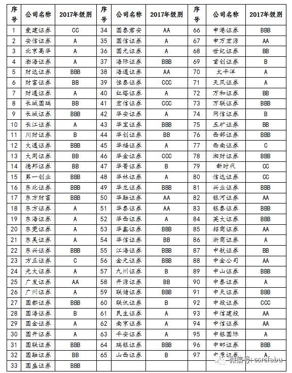 2017年各证券公司分类结果如下(按公司名称拼音顺序排序):